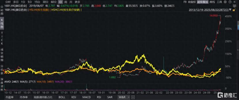 蓝线:康臣药业 橙线:恒生指数 黄线:恒生医疗保健指数